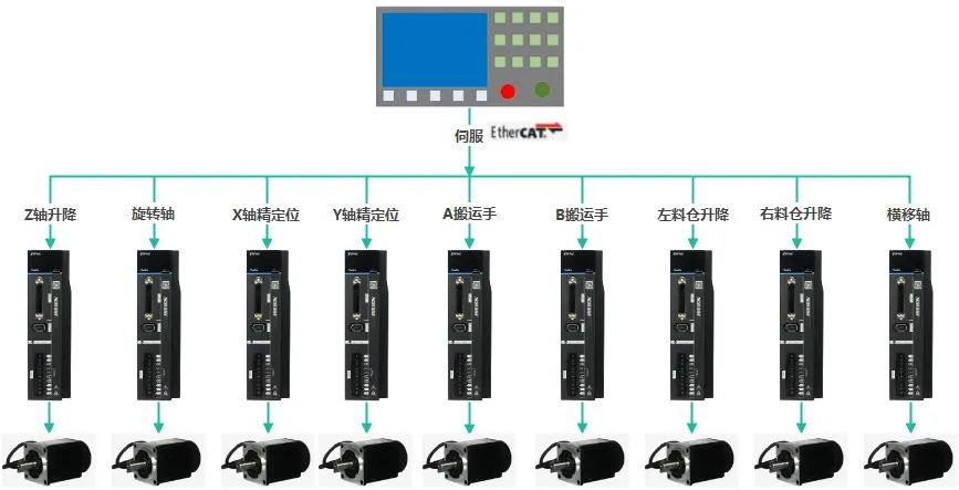 EtherCAT組網通訊,各個伺服在不同的工位分別控制升降、旋轉、搬運等工作,實現高速高精密生產?,F場圖片及流程示意圖如下。